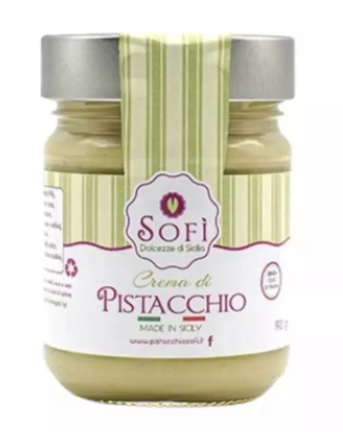 Pistasjkrem. Laget med 45% Bronte pistasjkjerner fra Etna, Sicilia. Nydelig på brød og toast, som fyll i kaker og bakverk, eller i smothies og over is. Uten palmeolje.